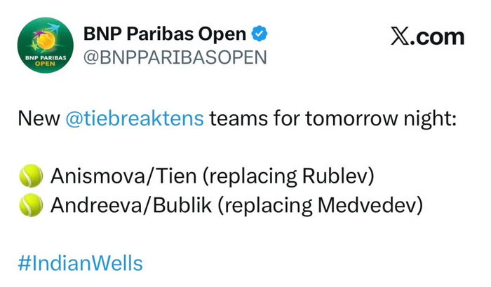 就在外界一直在等待梅德韦杰夫和卢布列夫是否已经顺利离开迪拜的最新消息时,印第安维尔斯官方的另一则新消息却提前来了,直接官宣取消了这对哥俩的混双抢十表演赛资格,由勒纳钱和布勃利克替代。